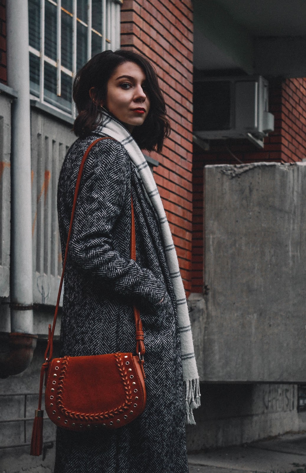 I guess my storytelling begins the night before the photoshoot. It was a Friday, so that meant it was obligatory for me to have a social life and party. This resulted in me going to bed at around 4.30 AM and getting up at 10 AM in order to get ready and look (half) presentable. Before Petar and I met up the weather was totally fine, a bit cloudy, but that wasn't bad. And then alas, rain started to pour down like a faucet that's been turned on full blast, so there went our ideas of shooting outside. With our problem in mind, we headed to a nearby parking building where we took some really cool shots (all hope was not lost yet!) and just as we were finishing up, the skies cleared up and there was a small window of possibility to shoot outside. So, we headed towards the municipality of Kapishtec, with a set idea in mind - take photos of the cool brick buildings! By now you must be thinking Okay, this isn't so bad. Well, you'd be right if we've had umbrellas with us because it started to rain EVER HARDER than before. And then, after hours of raining and me not being properly dressed for the weather - it started to snow. Yep, out of nowhere, we had our first snow for this winter in Skopje. I returned home soaking wet and cold, but at least I knew we had some really cool shots on a day where everything went wrong.